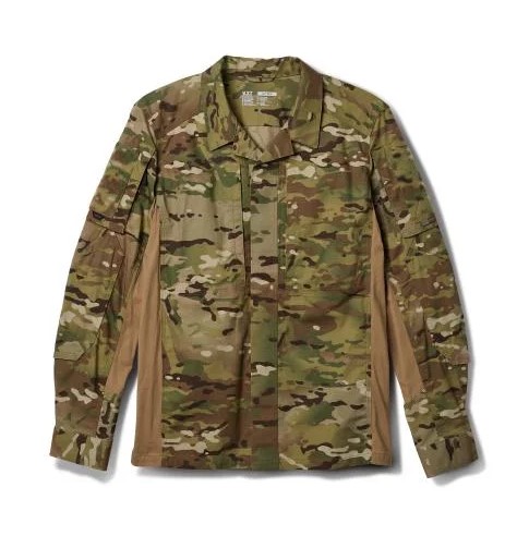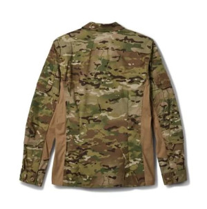 Рубашка изготовлена из двух типов материалов: износостойкий Ripstop MultiCam® и боковые вставки из трикотажной ткани. Основная ткань Ripstop имеет оригинальную окраску MultiCam®, а в ее составе сочетаются хлопок, нейлон (Cordura®) и эластан. Комбинированное плетение Ripstop имеет высокие прочностные показатели на разрыв и стойкость к истиранию. Камуфляж MultiCam® отлично сохраняет цвет и не меняется под действием УФ-лучей. Также эта ткань нанесена специальной пропиткой DWR (Durable Water Repellent), позволяющей сделать ткань устойчивой к воздействию осадков.